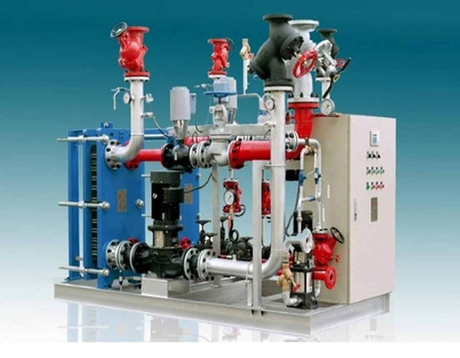 蒸汽或高溫水在溫控閥控制下,按供熱系統所需流量送入換熱器,換熱器以間接換熱方式將熱用戶的采暖(空調)回水加熱;被加熱水首先流經不銹鋼芯除污器,再經循環泵進入換熱器被加熱后供用戶使用,周而復始。一次熱媒在換熱器換熱后又回至一次供熱管網。系統的水量損失由補水泵按設定的壓力自動補充,確保系統壓力穩定、正常運行。